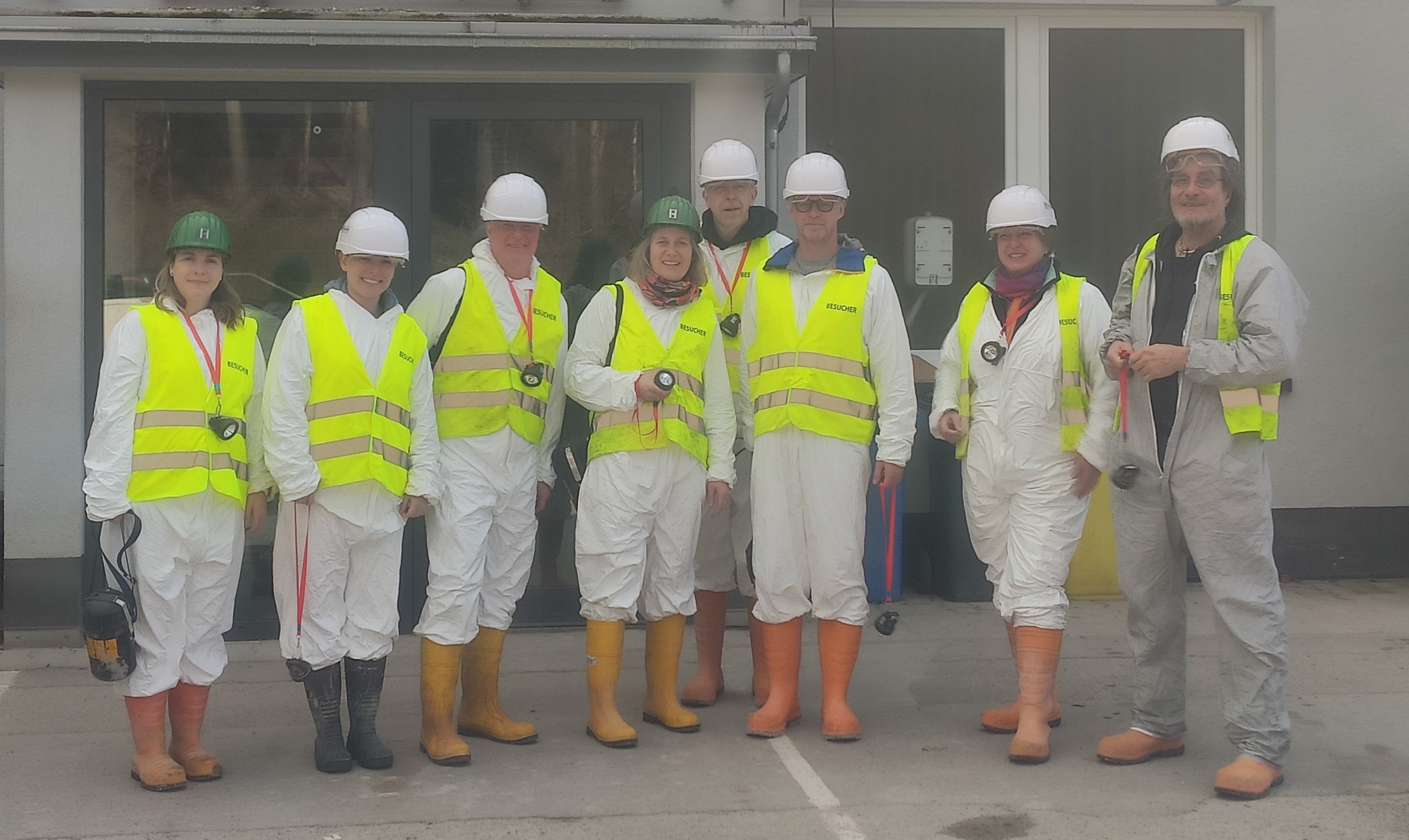 Dann wurde es praktisch: Ausgestattet mit Overalls, Helmen, Lampen, Warnwesten, Gummistiefeln und Sauerstoffflaschen ging es gemeinsam mit Grubenbetriebsleiter Peter Schleibach in die Tiefe. Mehrere Stunden lang führte er uns sicher durch die aktive Grube – ein echtes Privileg, denn Besichtigungen sind hier normalerweise nicht möglich. Auf einer schmalen Straße mit entgegenkommenden LKWs und steilen Abfahrten fuhren wir immer weiter in den Berg hinein. Von ehemals ca. 500 Höhenmetern ging es weit in die Tiefe – bis wir 250m unter dem Meeresspiegel waren.