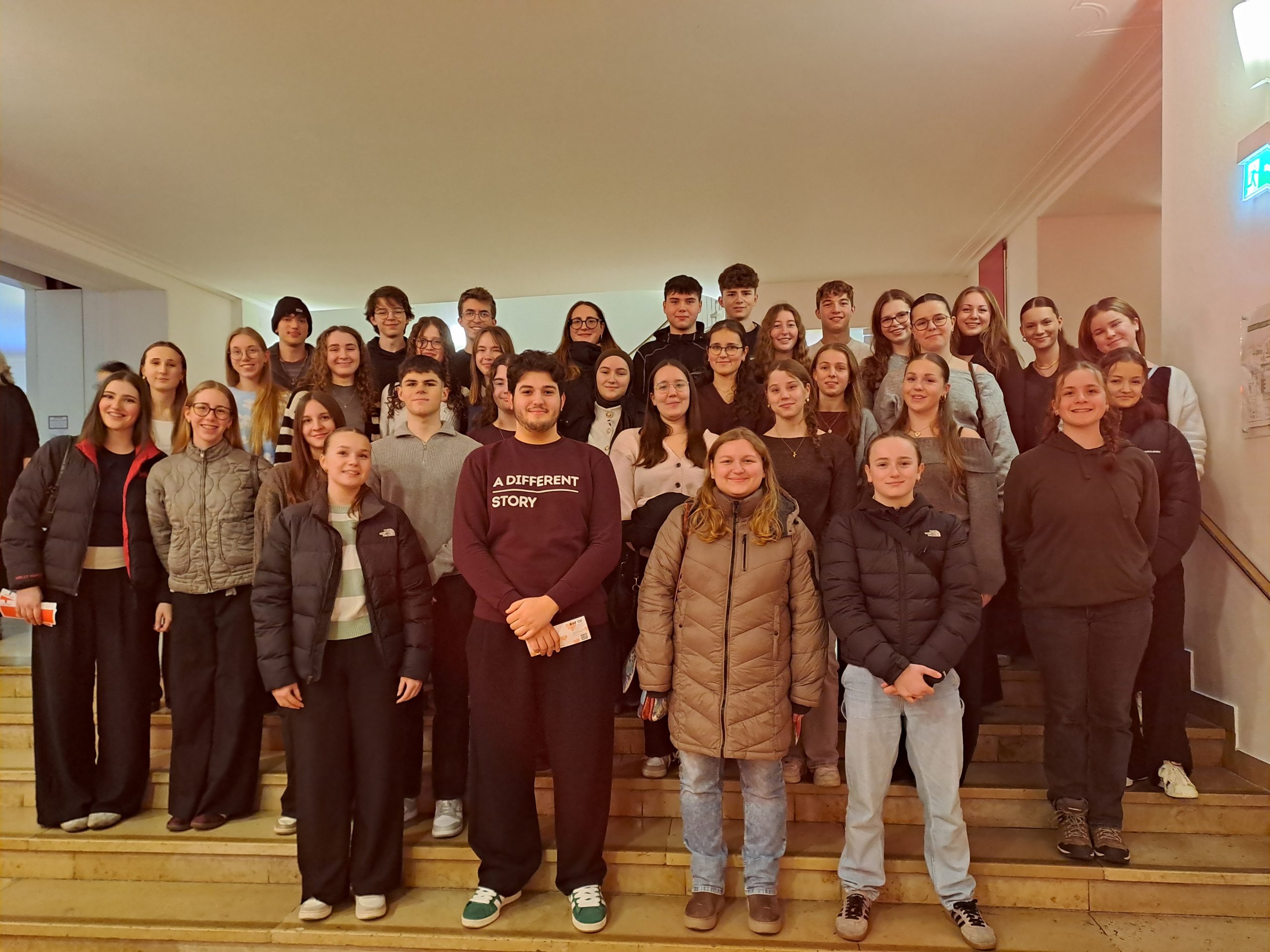 Am 17.12. besuchte die Kursstufe J1 gemeinsam mit Frau Moosmann-Beyer das Freiburger Theater, um Kleists „Der zerbrochne Krug“ zu sehen. Trotz Klausurenstress und weihnachtlicher Vorbereitungen zeigten sich die SchülerInnen hoch motiviert und gespannt auf die eigenwillige Inszenierung des Dramas. Entsprechend unterschiedlich fielen die Rückmeldungen im Anschluss aus: Aussagen wie „Ich habe mehr verstanden, als ich dachte“ oder „ein absoluter Fiebertraum“ verdeutlichten, wie sehr die Aufführung Eindruck hinterlassen hatte. Besonders das ungewöhnliche Setting sowie der Cast, der mit eigenwilligen Bewegungen und Gesten gleichermaßen irritierte wie zum Schmunzeln brachte, wurden hervorgehoben.
