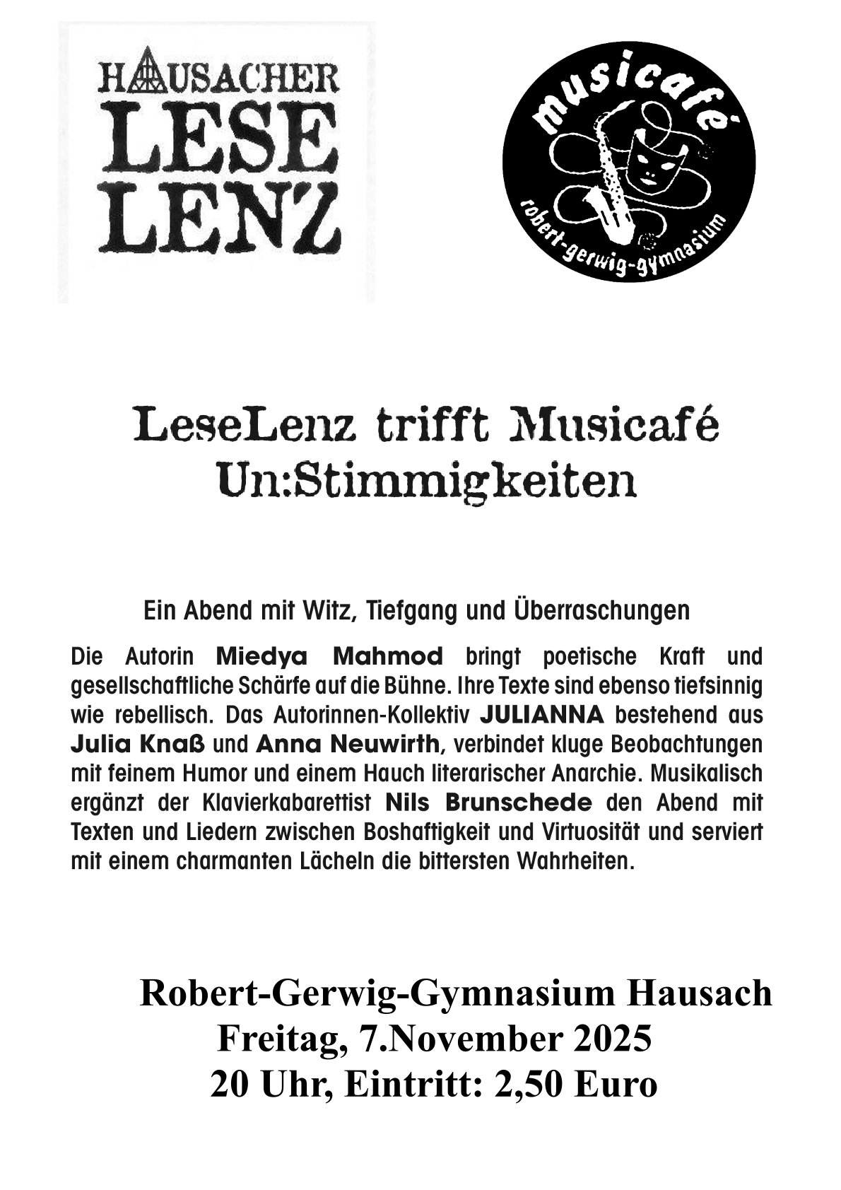 Eine Veranstaltung in Kooperation mit dem Hausacher LeseLenz im Robert-Gerwig-Gymnasium Hausach, Beginn 20 Uhr, Eintritt 2,50 Euro.